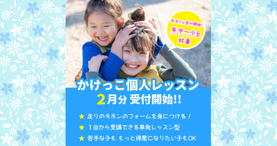 2026年2月開催分の個人レッスンより、年中さんの受講受付を開始しました。来春に 幼稚園・保育園 最後の運動会を迎えるみんな、今から速くカッコよく走る方法を覚えて練習しよう!